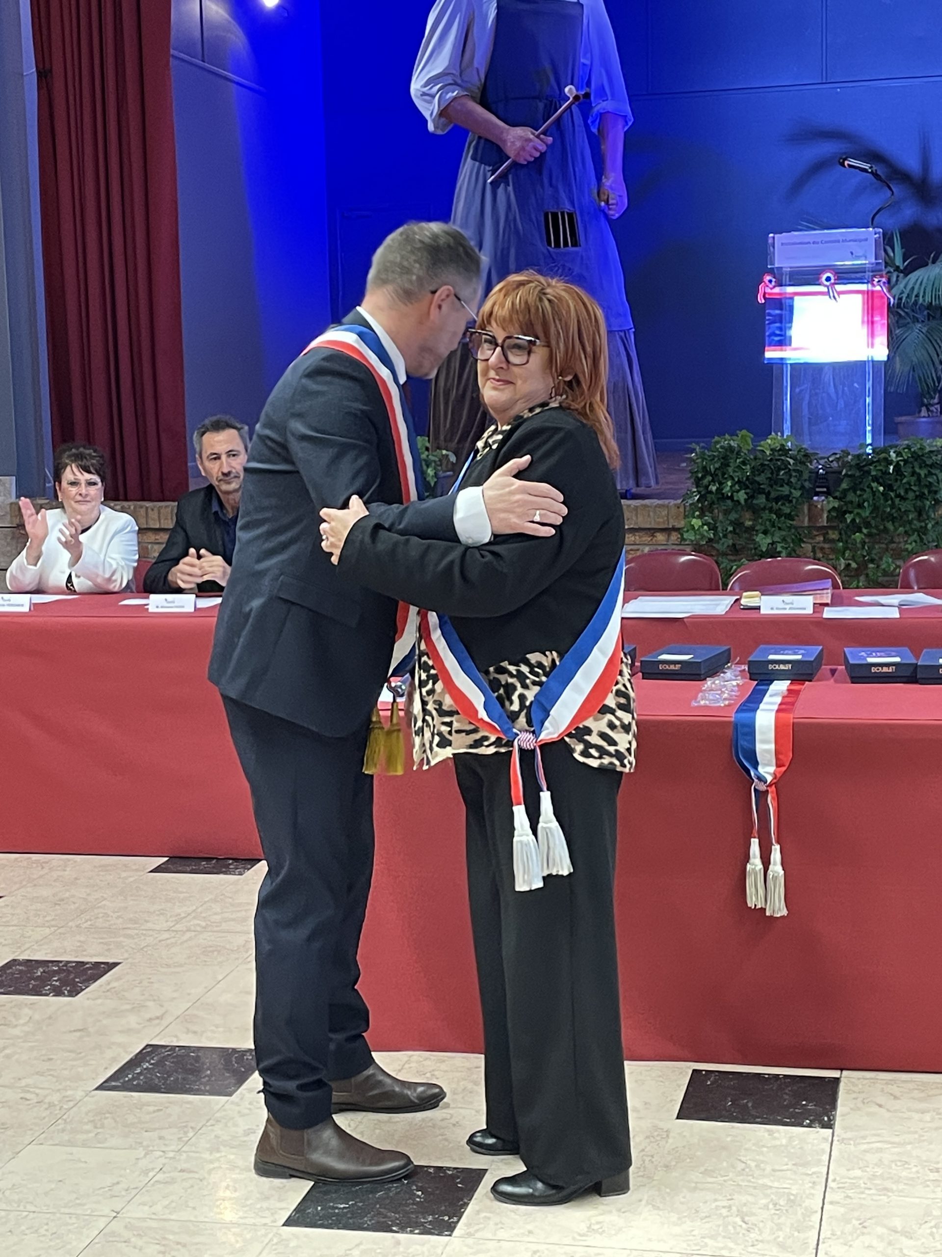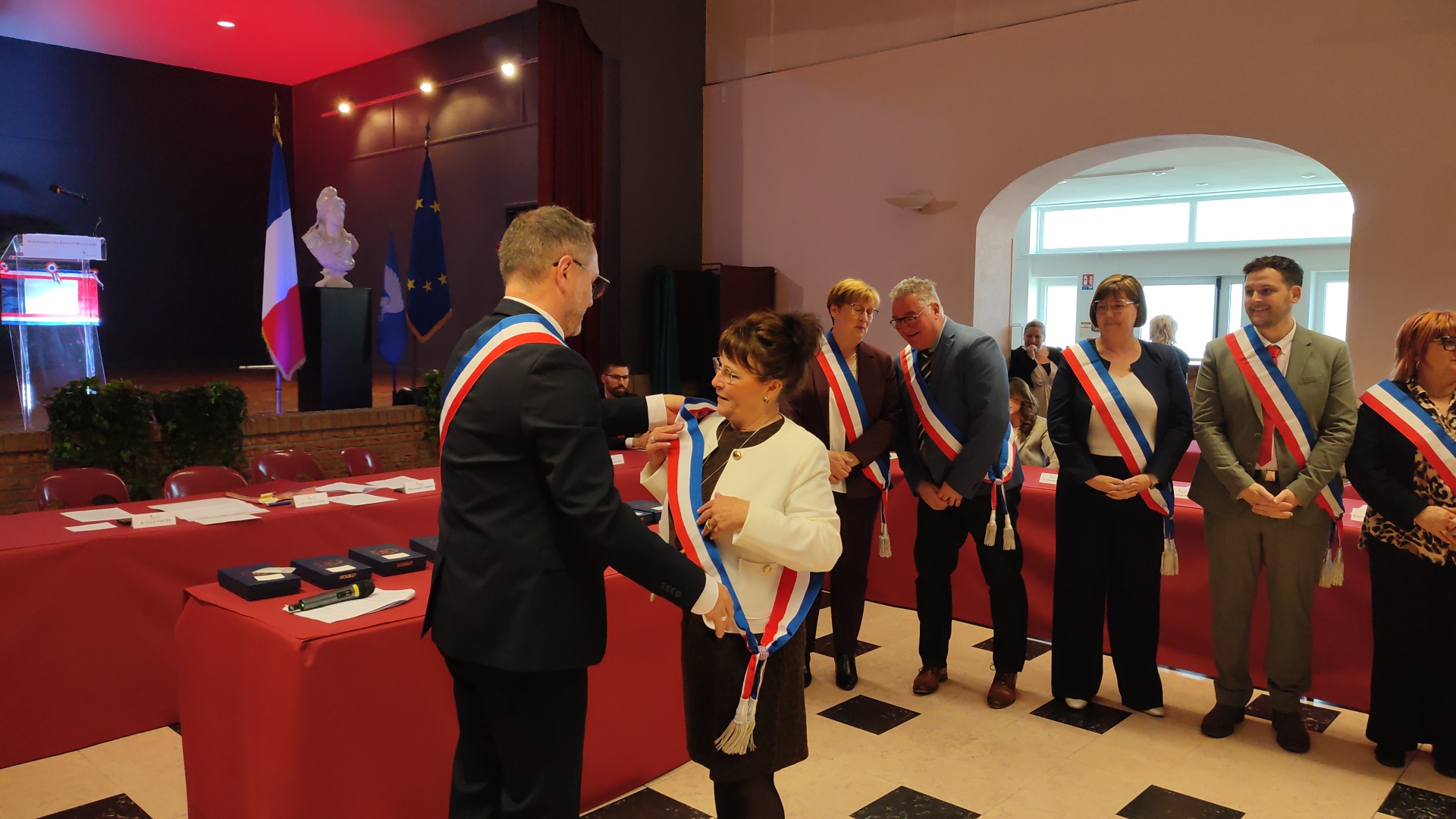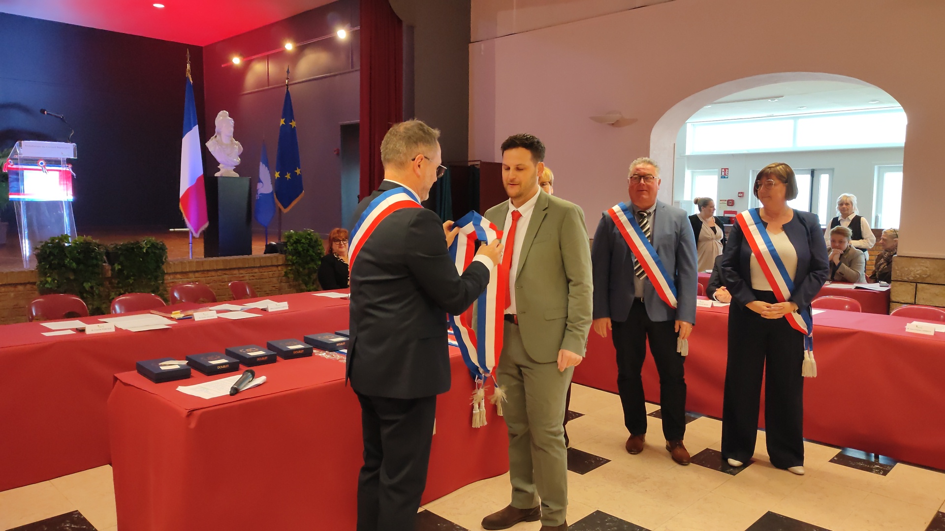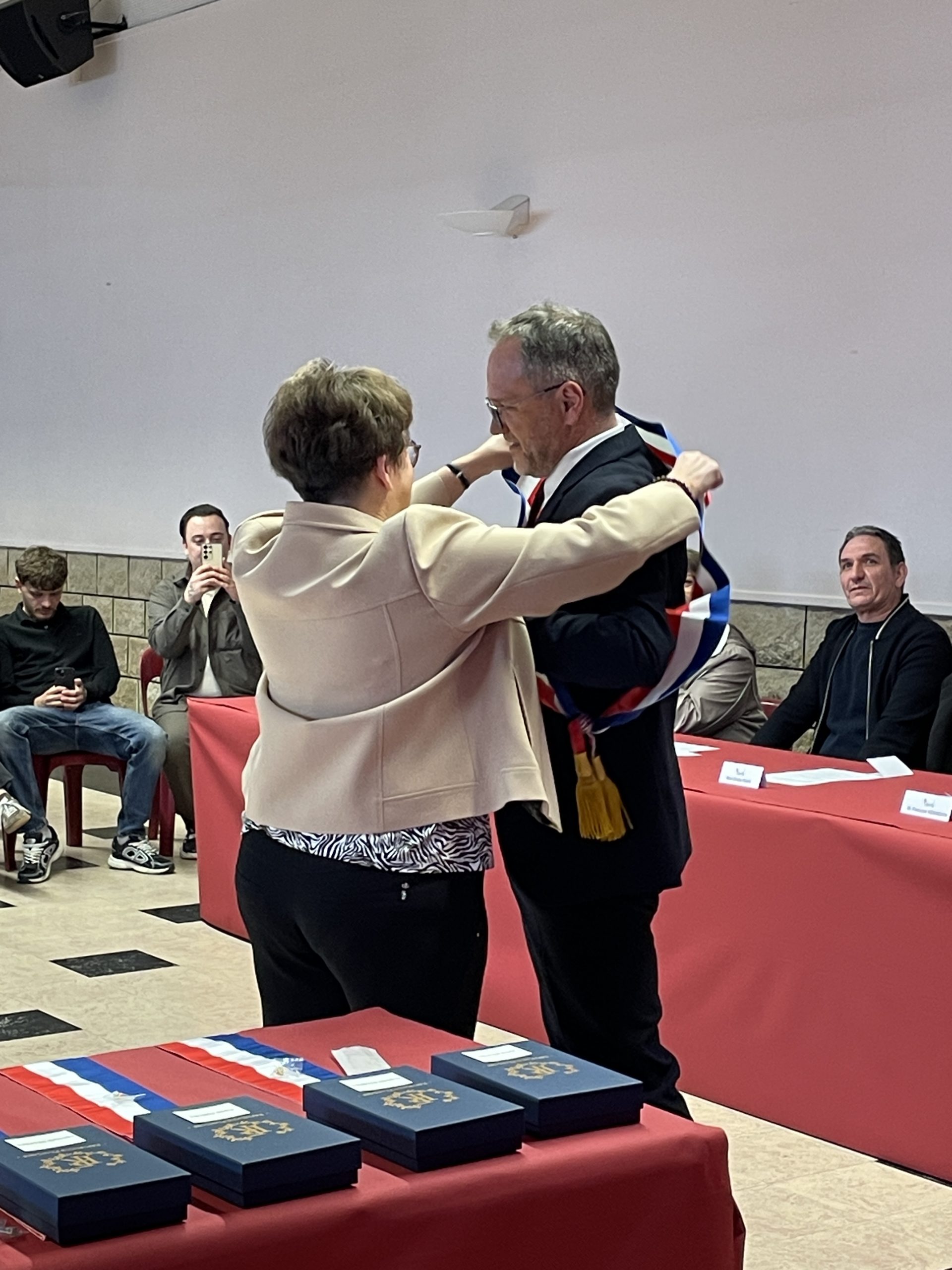 Beaucoup de joie et d’émotion au moment de la distribution des écharpes et des insignes aux nouveaux élus de ce conseil largement renouvelé, ainsi que l’a rappelé Xavier Jouanin dans le discours qui a suivi :