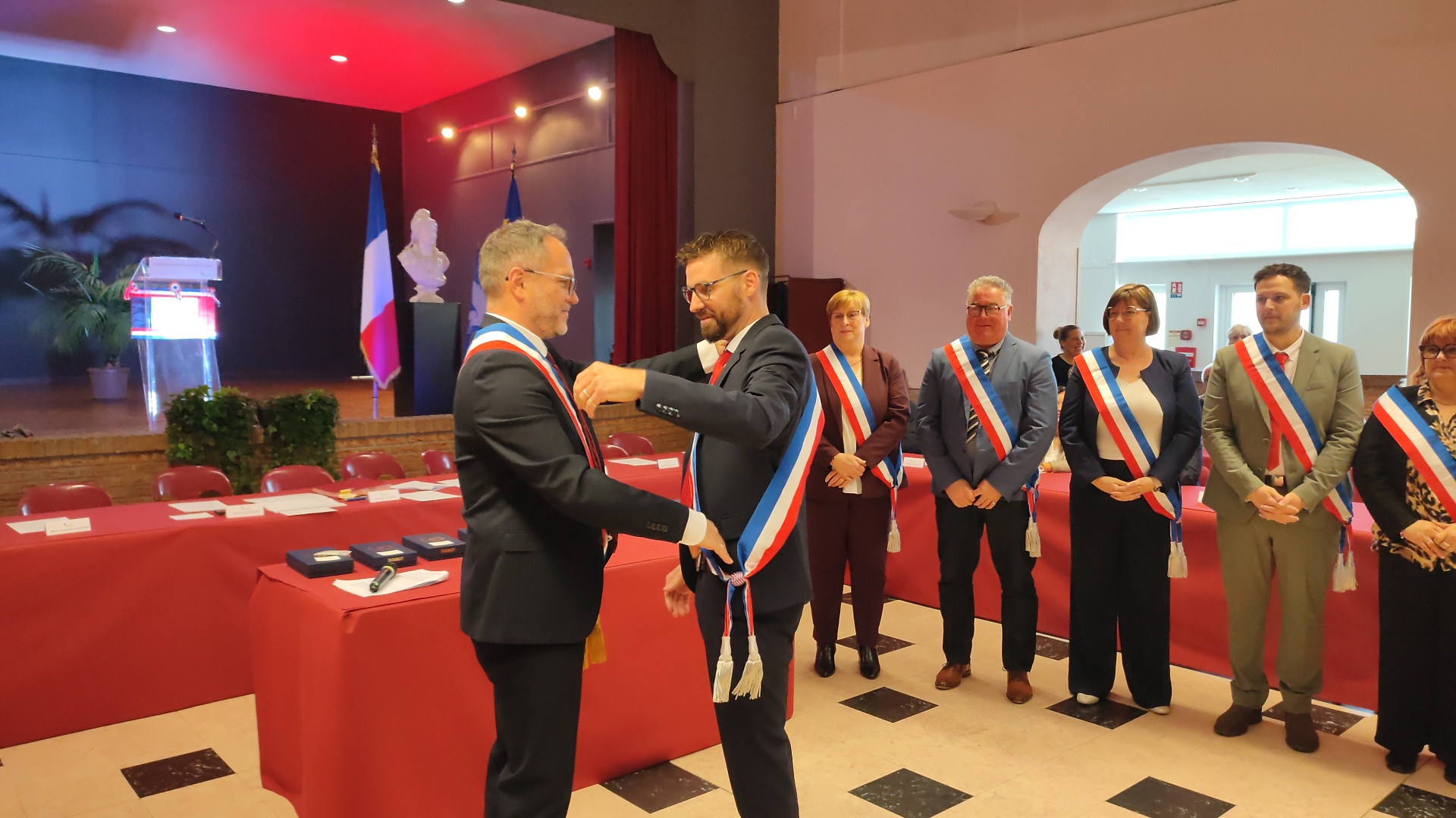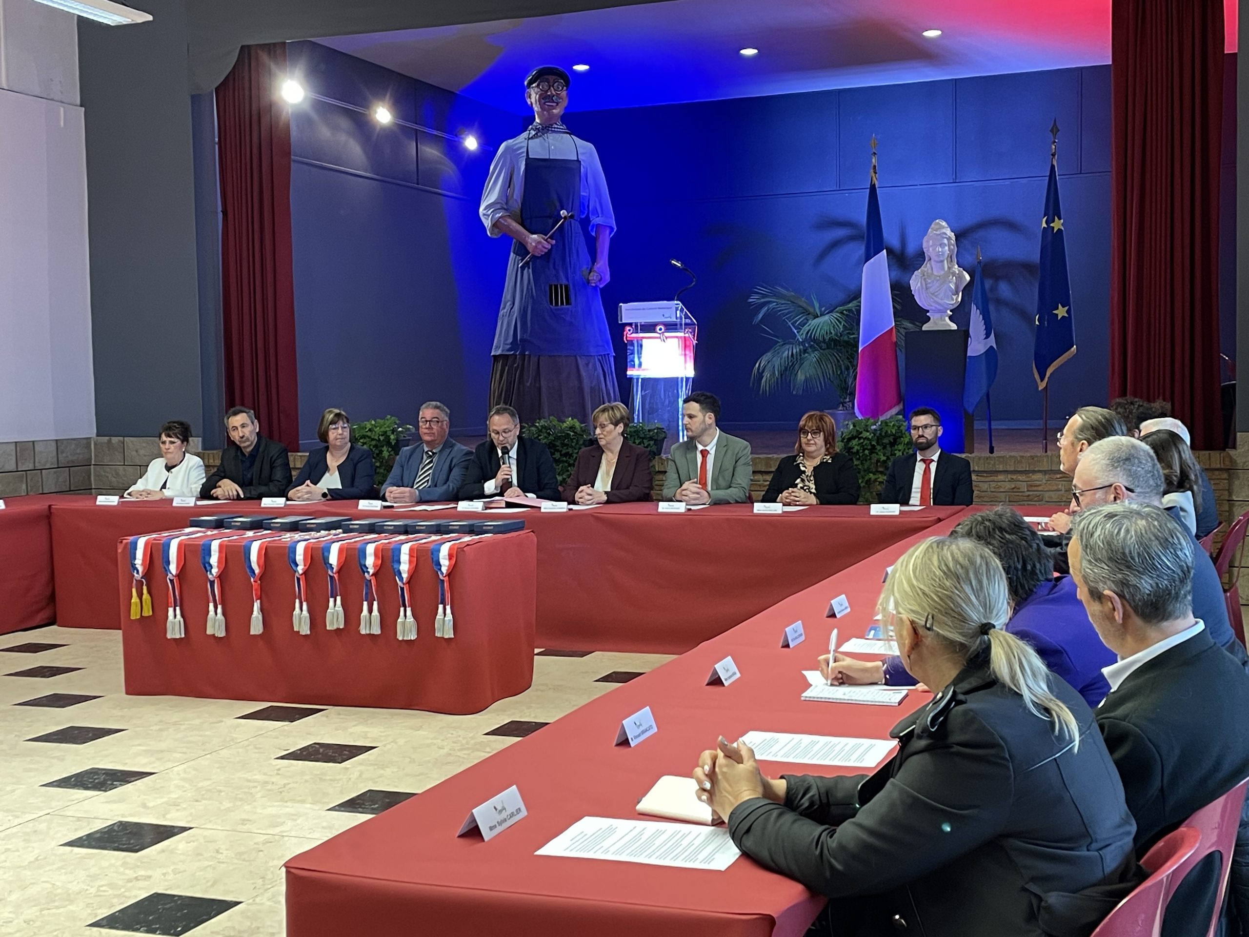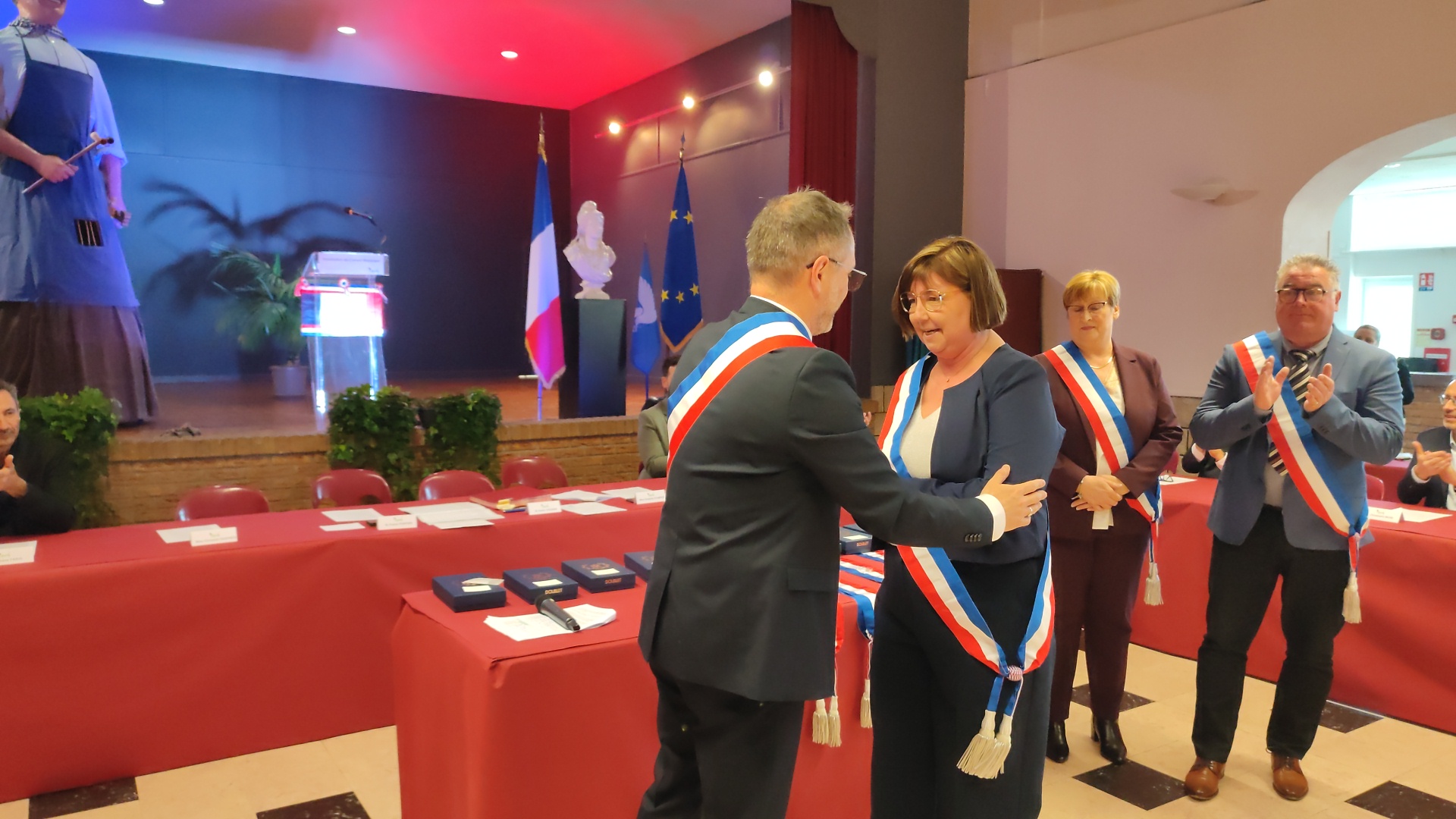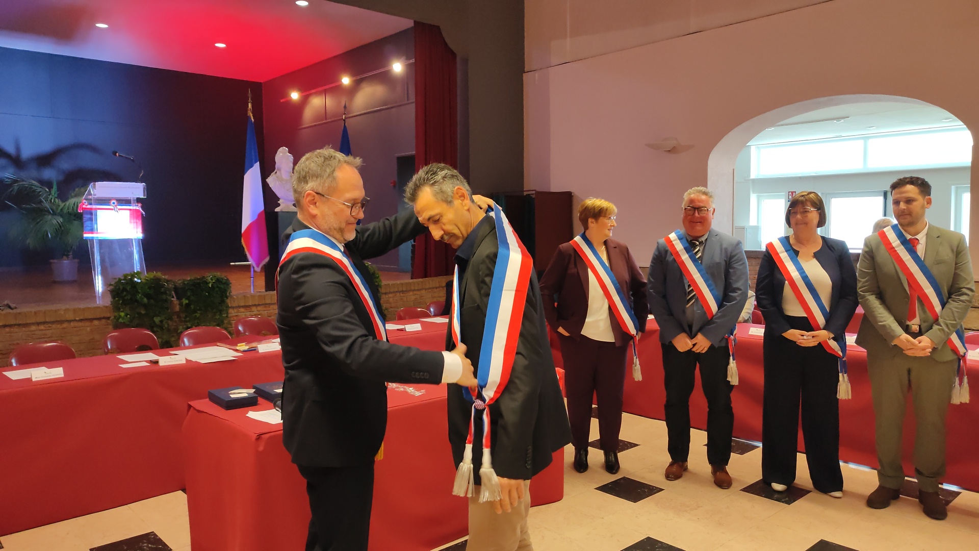 Beaucoup de joie et d’émotion au moment de la distribution des écharpes et des insignes aux nouveaux élus de ce conseil largement renouvelé, ainsi que l’a rappelé Xavier Jouanin dans le discours qui a suivi :